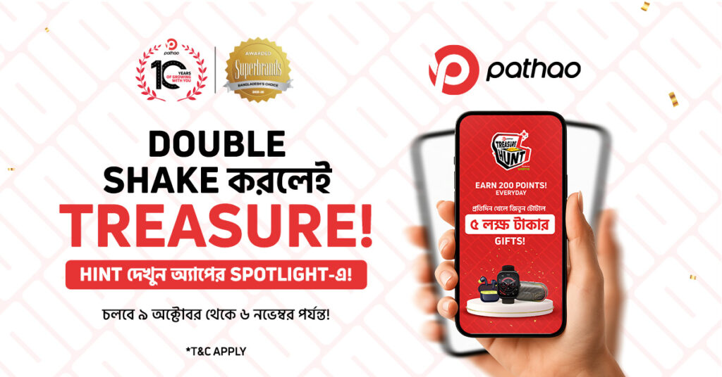 Your Pathao app just got more exciting! From 9th October to 6th November, Pathao’s Treasure Hunt is here to keep you on your toes. Follow the daily clues in the app’s spotlight story, explore the hidden corners of the Pathao App, and shake your phone twice to reveal the instant reward of 200 Pathao Points. Each week, top participants will unlock even bigger prizes with a grand reward pool of 5 lakh TK, powered by Oraimo Bangladesh. So, are you ready to hunt?