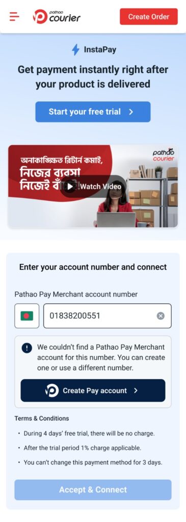 ১। আপনার পাঠাও কুরিয়ার মার্চেন্ট অ্যাপে সাইন-ইন করে Enable InstaPay বাটনে ক্লিক করুন।